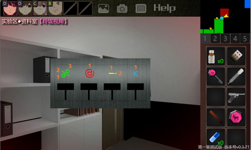 操作“回”机关,发现可以把带颜色的一面【金属片】放入机关。全部放入机关后,再回到【实验区·资料室】,孤岛机关可能有几个被点亮,点亮的部分说明颜色【金属片】放置的位置是正确的,否则就是不正确的。