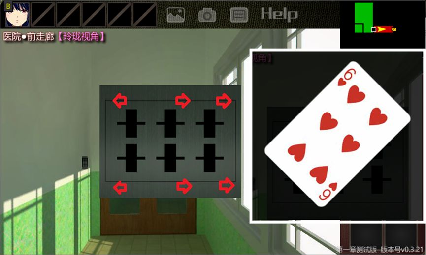 7.出门,进入【医院·(白天)前走廊】。解开左侧的密码器。发现是2x3的按钮,可以根据【扑克牌】得到答案,红桃6正好对应6个按钮,把按钮按到红桃图案的钝端一侧即可解开谜题。点击前方的门,折跃到【医院·(白天)后走廊】。