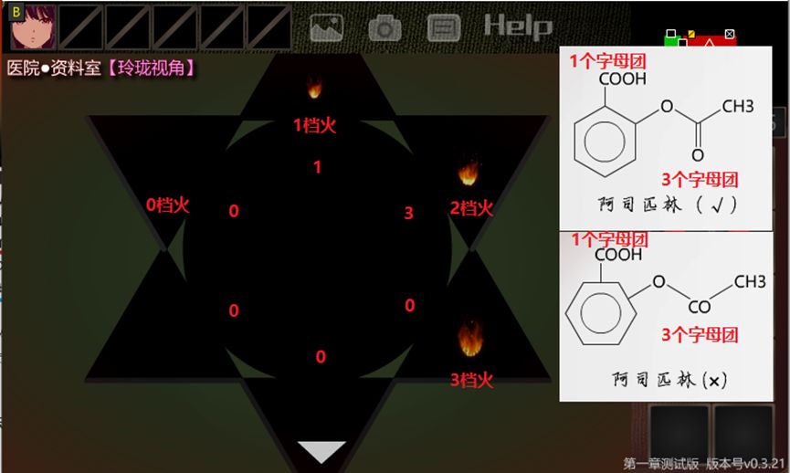 15.回到最初房间【医院·(白天)病房】,把4个【金属片】收走,“回”关闭。然后再回到【医院·(白天)资料室】,点击六芒星法阵,发现投入【人偶的躯干】打不开。又发现点击火焰是可以调节大小的。把上面的火焰点成最小的(1档),右上角的火焰点成最大的(3档),剩下的都点灭(0档)(顺时针就是130000),再投入【人偶的躯干】,打开隧道,进入【化工厂·实验室】。