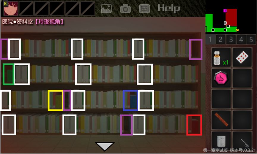 原理:【医院·(夜晚)资料室】的书架,有白色的小堆书(对应金属片)、有蓝、绿、红、黄色书(对应四色金属片)、还有空隙,按照它们的位置从右往左摆就行了。
