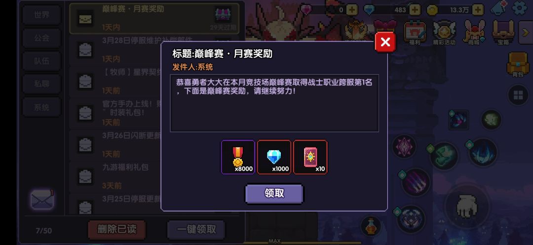 大秘境、世界boss以及巅峰月赛,根据排名发放一定数量的钻石。一般每月2000钻石,伤害高的大佬最多800+2500+1000=4300钻石
