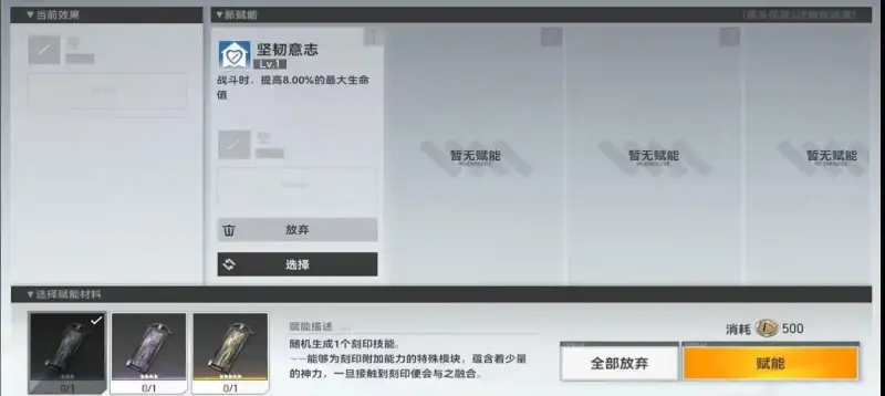 【低级赋能块】:随机生成1个刻印技能(低概率红色,高概率蓝/黄色)