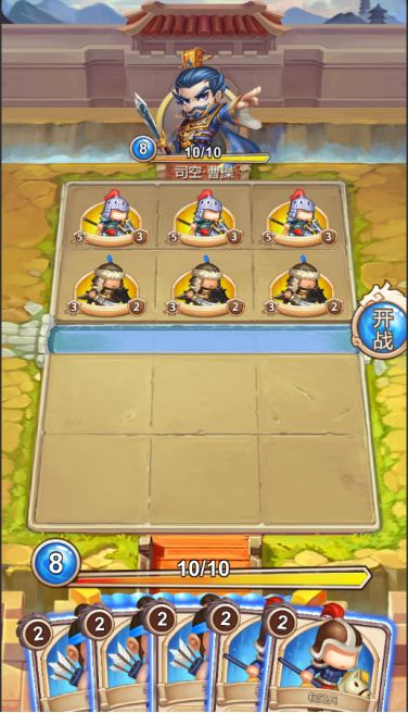 开始手牌会获得3张0/1弓,以及2张3/1的骑兵。弓手具有出阵对前方敌人造成2点伤害