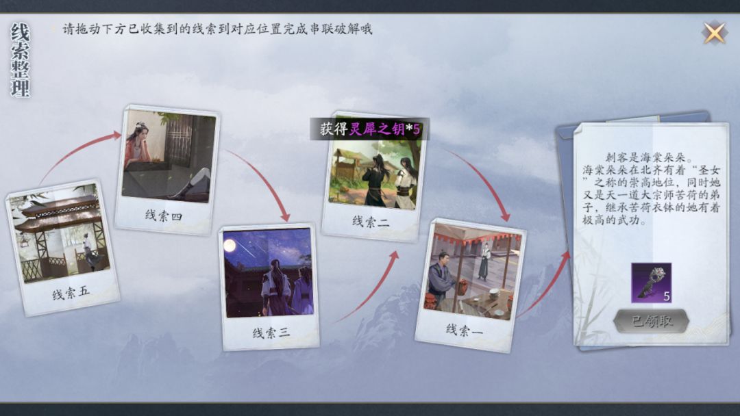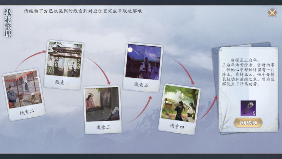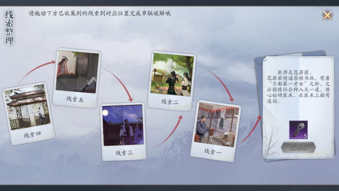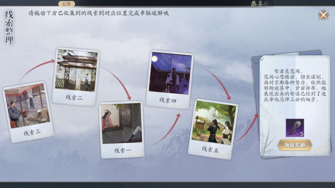完成一个小章节之后,玩家需要把搜集到的线索联系起来,第二章,智者一节的线索顺序是32145。这一节我们可以得知,所谓得智者就是范闲,他的才智已经为庆帝所忌惮。