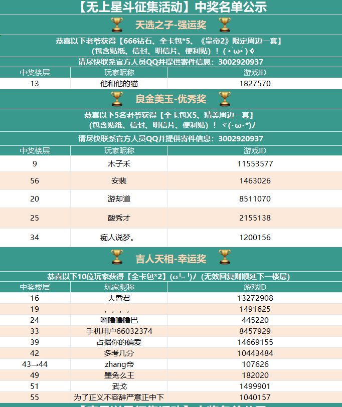 奖励道具近期将直接发放到大人们的游戏遗诏中,请中了实物周边的老爷尽快添加官方人员QQ:3002920937,并提供收件信息,我们将尽快安排快递寄送