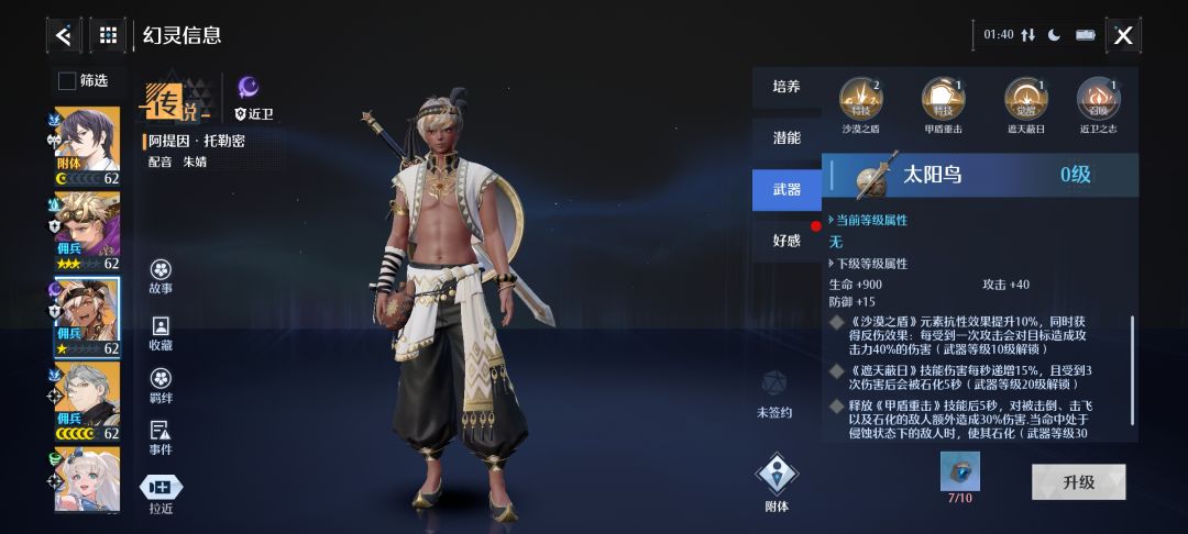 上图是诺亚的特有潜能,英勇近卫。不同传说幻灵特有潜能都有着不尽相同的效果,而近卫使用的武器不同,也会给团队带来不一样的增益特点。例如:阿提因可以直接为队友提供全元素抗性,诺亚则能通过技能控怪。