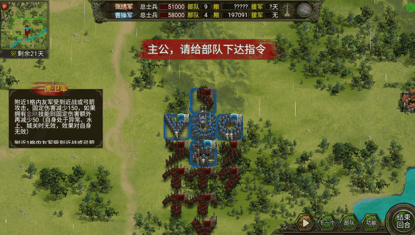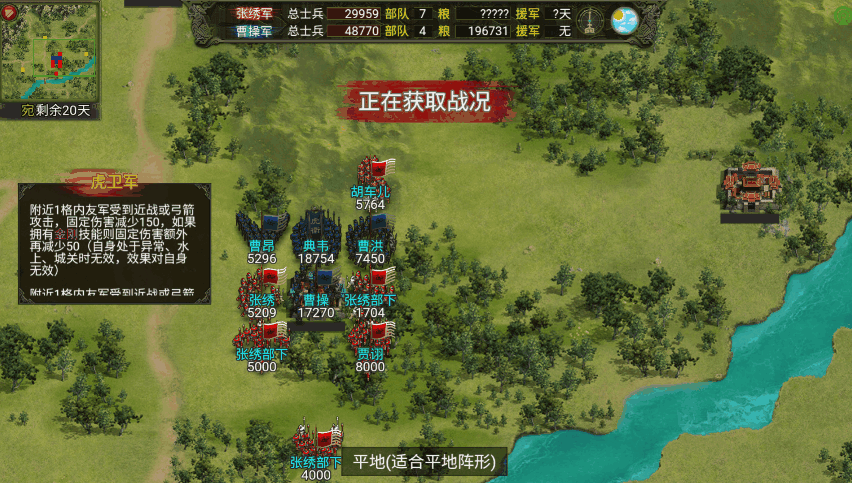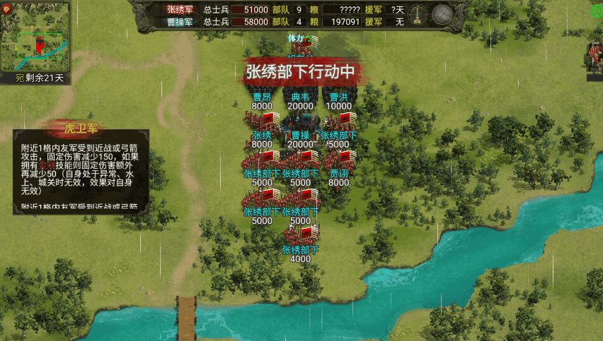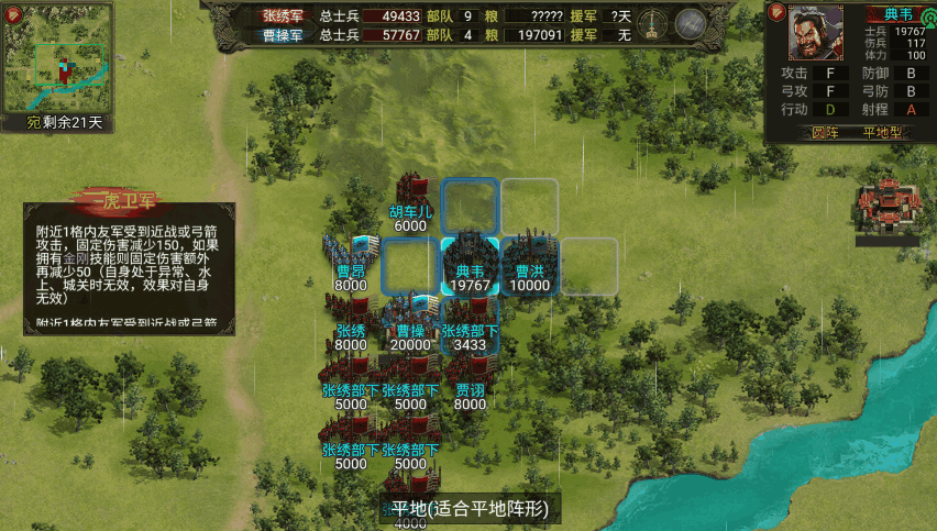 许褚或典韦为主帅时,在分摊友军伤害时有20%的几率只受到1点伤害(不会溃散)(自身处于异常、水上、城关时无效)