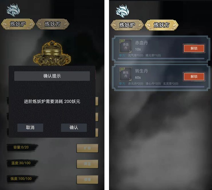 2、炼丹界面中的温度和强度怎么理解?你可以这么理解看过小说的都知道,炼丹要控制火候,一直炼丹肯定高温得降温,高强度的炼丹,丹炉强度也会破损。每次炼丹之前花一些妖元(妖元获取详见第一点),对温度项降温,对强度项修缮。即可继续炼丹。
