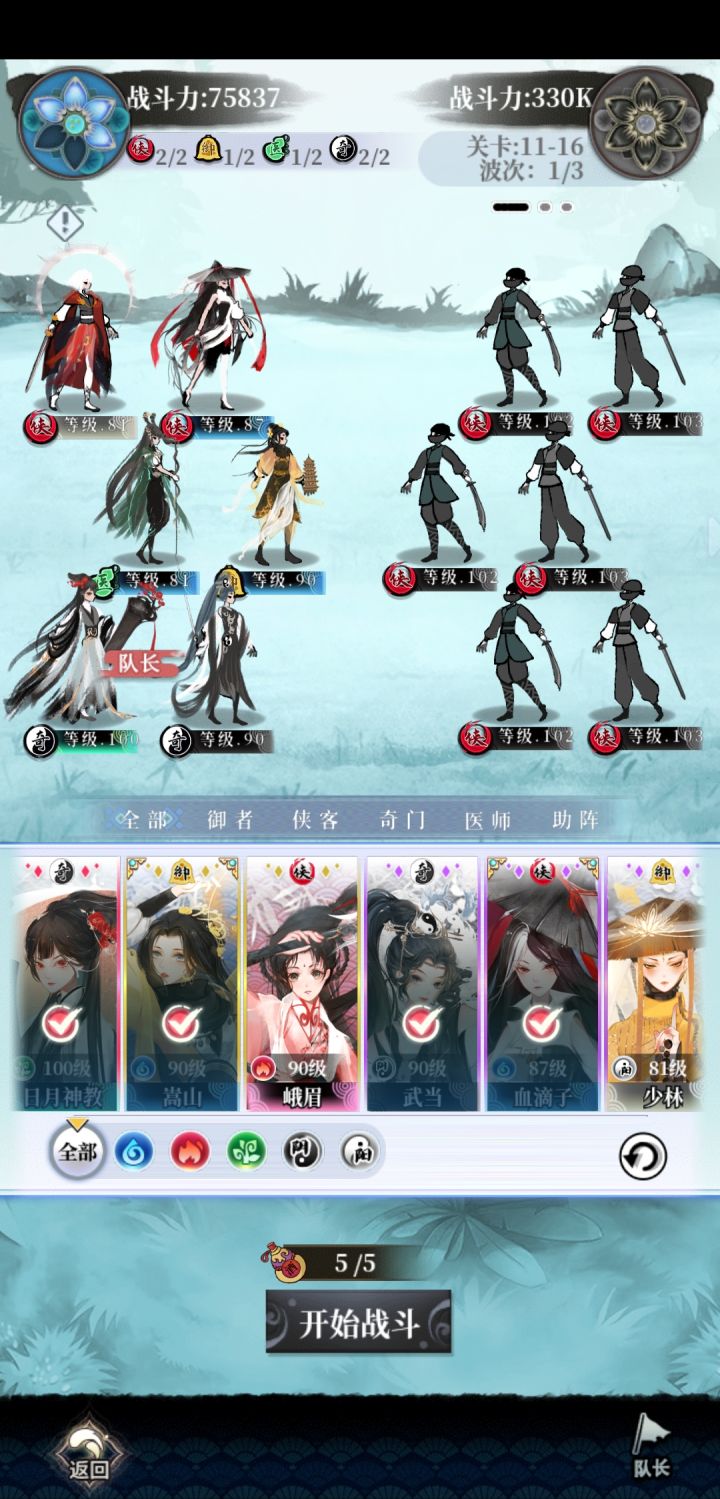 再来个低配阵容,华山是人权卡,推图很重要,注意调整站位就行了,血滴子是人品前排