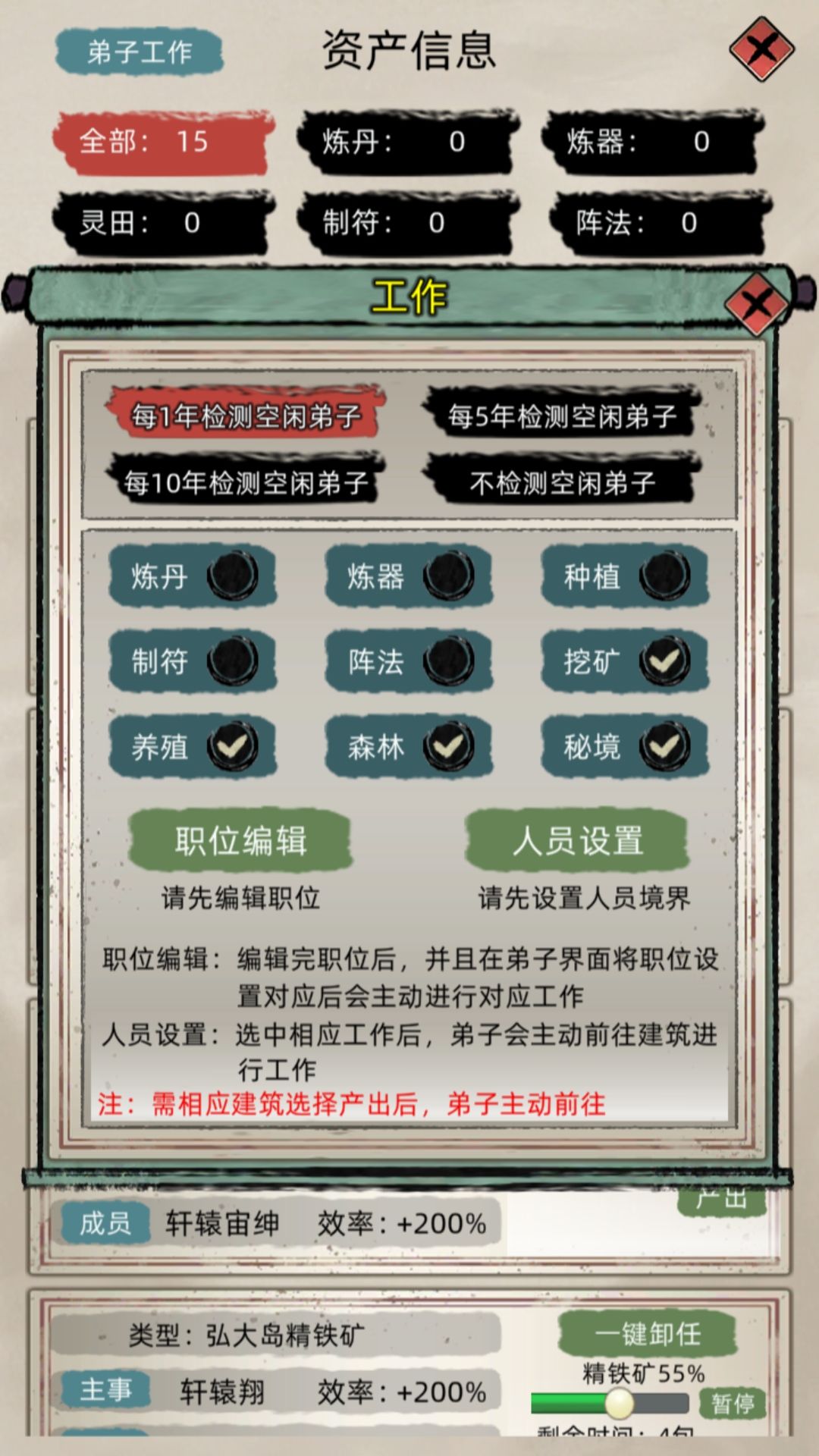 1. 首先是弟子工作设置,先勾选需要自动派遣工作的类别,前期就是挖矿养殖森林秘境,种田流前期田少的时候也可以把种植选上,后面田多了勾选的性价比就不高了可以再去掉。勾选造成后设置自动检测空闲弟子时间,一般都是选1年间隔。