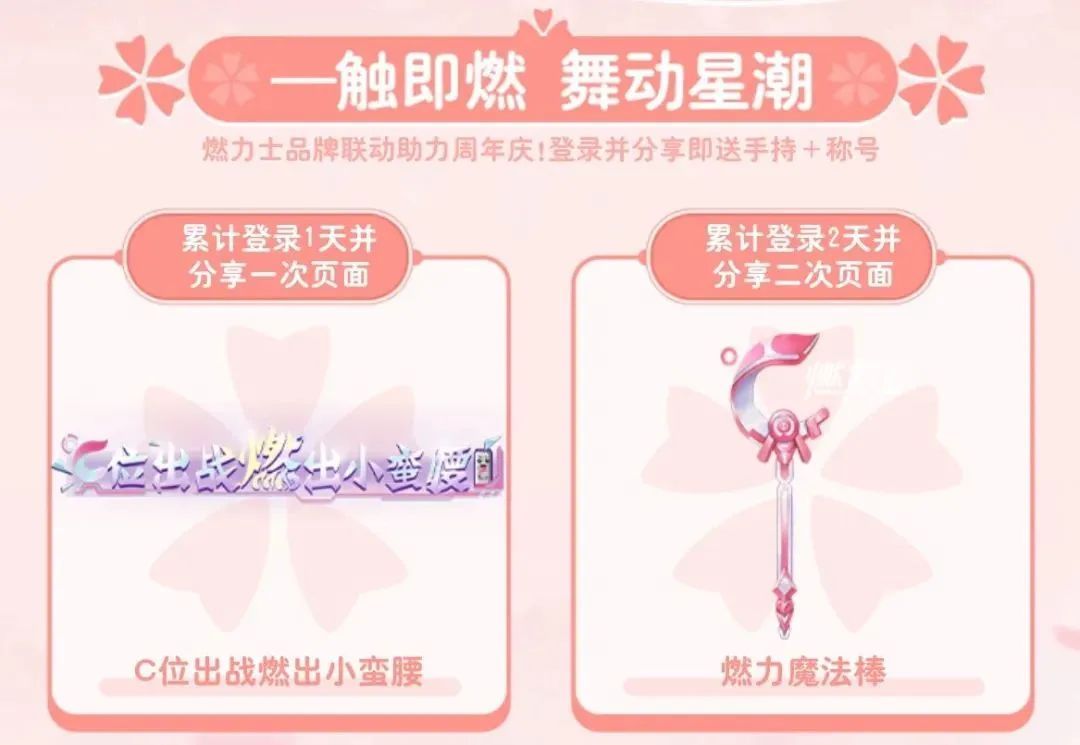 累计登录并分享即可获得燃力士联动道具:C位出战燃出小蛮腰称号&燃力魔法棒手持!消耗幻堡币可抽取服饰&钻石好礼!