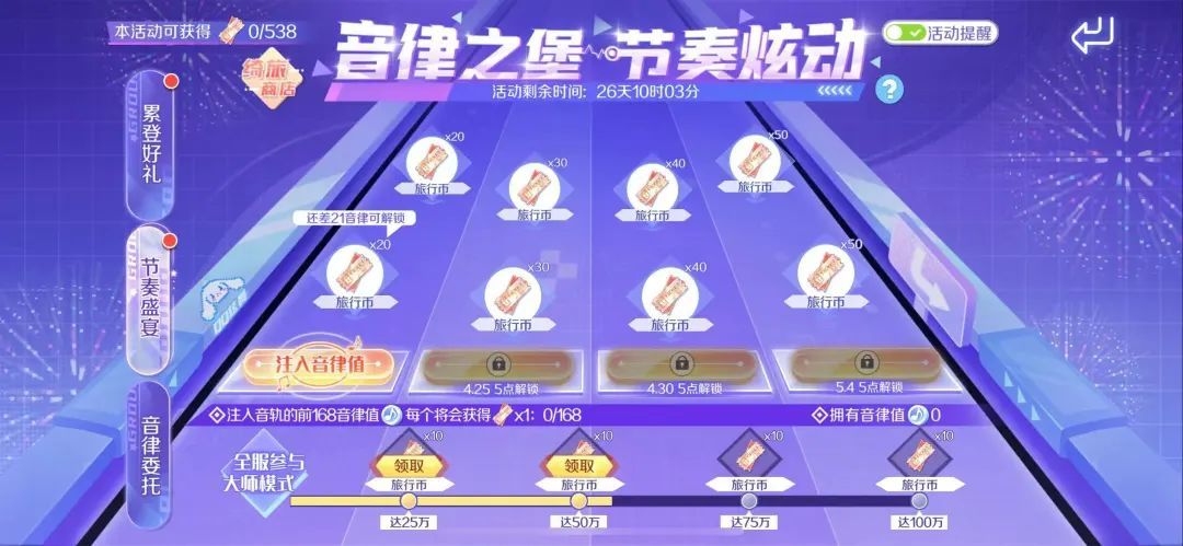 截止至5月19日,来参与限时活动【音律之堡·节奏炫动】,首次进入活动可获得PERFECT大师趣味称号!每日登录也可领取相应奖励,完成任务获得音律值,将音律值注入音轨即可获得海量旅行币哦~
