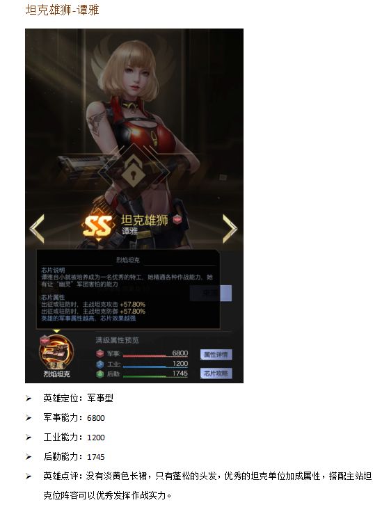 主战坦克不止有超高的攻击力和暴击能力,还有英雄“谭雅”和“鲍里斯”为坦克提供了更高的暴击概率和三围属性。配合一排抗性突出的防御坦克,有了高额攻击加成和暴击加成的“主战坦克”可以说是当前版本最的兵种之一。