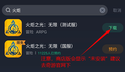 1、在奇‘’游手游版内找到“火炬之光无限(测试服)”然后点下载;