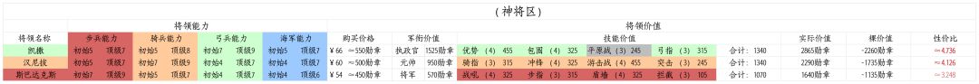首先说说三神,三神的强度无需我赘言,主要值得一提的是我在做表格时把三神的人民币价格换算成勋章,结果发现他们真的很便宜呀,最贵的凯撒66元换算成勋章才550,最便宜的斯巴达才450,可以说是绝对高性价比,所以建议如果氪金,可以先氪三神(当然不建议学生党氪)
