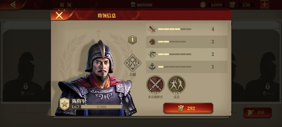 先说陈将军,陈将军我个人认为是铜将区里最好的步将了,输出有步指,虽然没有盾墙和伏击减损,但胜在天赋守卫和指技也算合得来,小小提升了陈将军的生存能力,反击则主要提升陈将军的反打能力,步将有反击也能将兵种技能伤害提升一块,打反击伤害,陈将军应该是铜区里自身天赋技能和定位契合度最高的一位将领了,惟一的缺点在于面板不行,戏称666😂不过这个也可以后期用装备弥补,所以问题不大,挺好一将