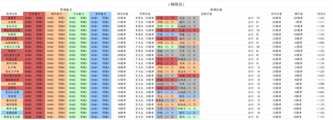 最近闲来无事,所以前天花了一天的时间做了一张包含所有将领能力和价值的表格,顺带附上一点我自己对这些将领的讲解,希望能给大家带来一些帮助,有不对的地方也请大家指点,不喜误喷谢谢😁
