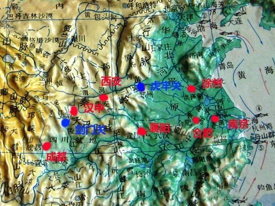 赤壁之后,曹操向北败退。上图的形势并未稳定,最终形成的局势就是这样。曹操占据了关中和华北,刘备占据了荆州,后来又拿下了四川。孙权继续据有江东。曹操与孙权的通道,只有江淮流域的合肥--南京一带。这个方向,魏军无力南下,东吴也拿以冲破合肥。曹操与刘备之间,就是汉中和荆州两个缺口,同样是守方占有绝大优势。如果孙刘始终保持友好同盟,至少相互之间不再攻伐,这就是一个十分稳定的局势。三足鼎立之势,就此形成。