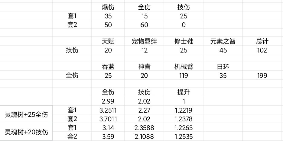 即使在不考虑爆伤的情况下,无论是灵魂树是用加25全属性伤害,还是用加20技能伤害,套2的伤害都大于套1