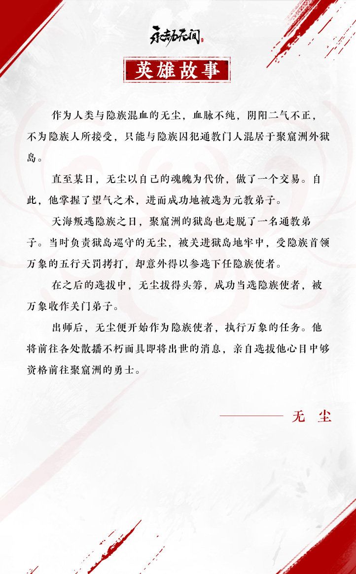 行无常执,应时而发。即使血脉非正,魂魄不全,仍凭借自己的力量成为隐族密使。他相信,万法不拘,才可破劫通玄。