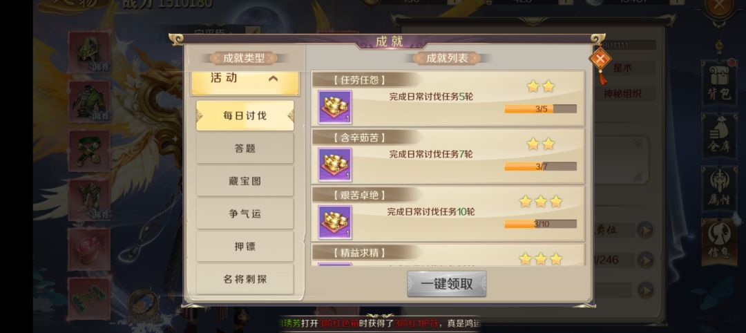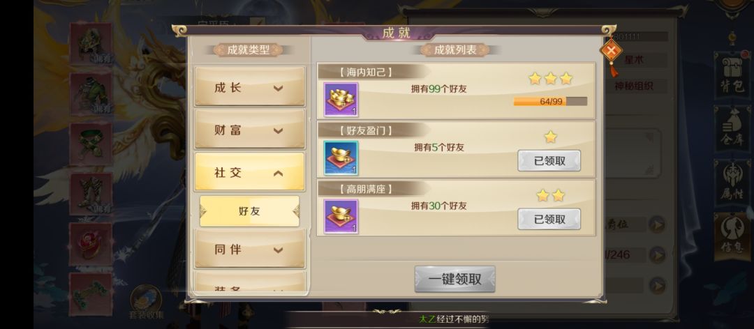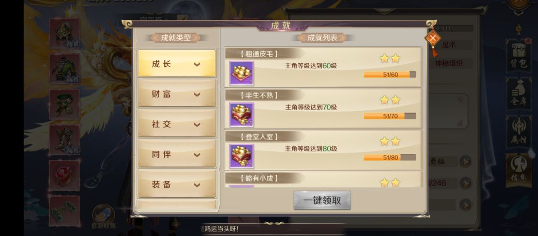 2.成就目标包括八大类:成长 财富 社交 同伴 装备 活动 帮会 任务;