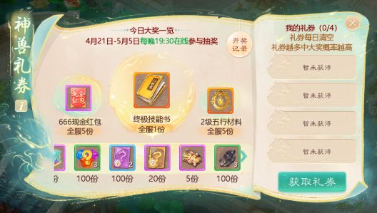 4月21日维护后~5月5日5点期间,侠士每天通过活跃度、打造召唤兽佩饰、消耗仙玉等途径可以获取抽奖礼券,每天最多可累积获得4张。每晚7点30分,游戏中将进行20轮抽奖,每天至少送出一只神兽或终极技能书、二级五行材料、666元现金红包及各种材料好礼。