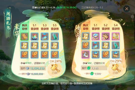 4月21日维护后~5月2日5点期间,“闲游礼包”活动开启,活动分为预售砍价期和正式发售期两个阶段。其中,4月21~26日为预售砍价期,此阶段中,侠士每天活跃度达到100点可进行1次砍价,活动期间最多砍价5次。