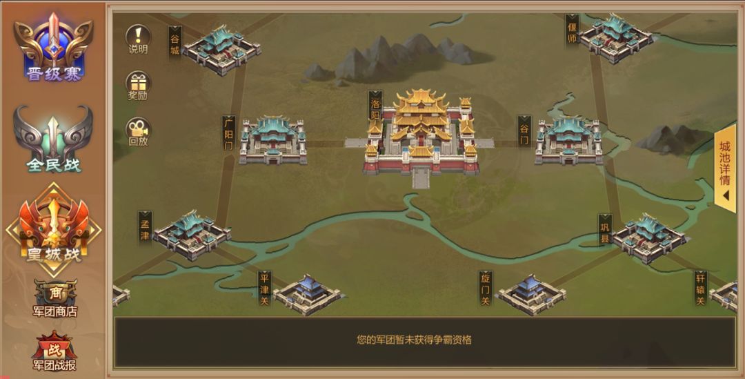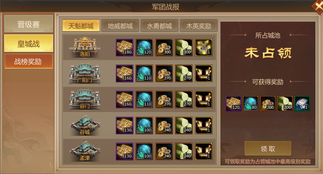 6、最终占领洛阳的军团成为皇城霸主,占领大型城池的军团也会获得相应奖励,奖励默认为所占城池中最高级别奖励,需军勋≥5000方可领取