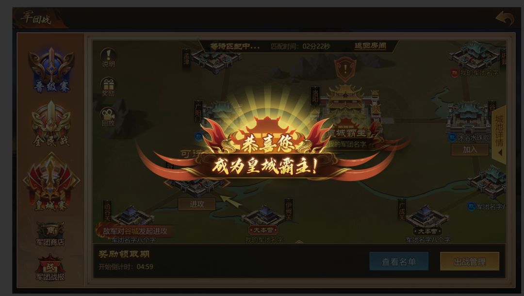 3、每轮前5分钟为匹配时间,可由军团长或副军团长点击高级城池发动进攻,并召集成员进入房间参战(军团房间人数<5人时将无法进行匹配,计时结束后未进行匹配的军团,本轮将被判负);