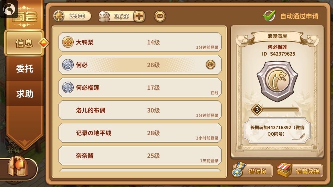 我又来了!!湖心镇新公会浪漫满屋S42979625欢迎新人故人加入,长期玩请加443716392(微信QQ同号)