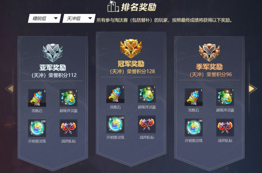 而在玩家进入淘汰赛阶段后,根据玩家所在战队的战绩,玩家还将获得洗炼石、超级淬灵露、开明兽灵珠、战斧队标、高级魔兽要诀等丰厚好礼。此外,系统还将会为玩家送上X9荣誉积分,用于解锁不同档次的称谓特效,让你的光荣战绩为更多人所知!