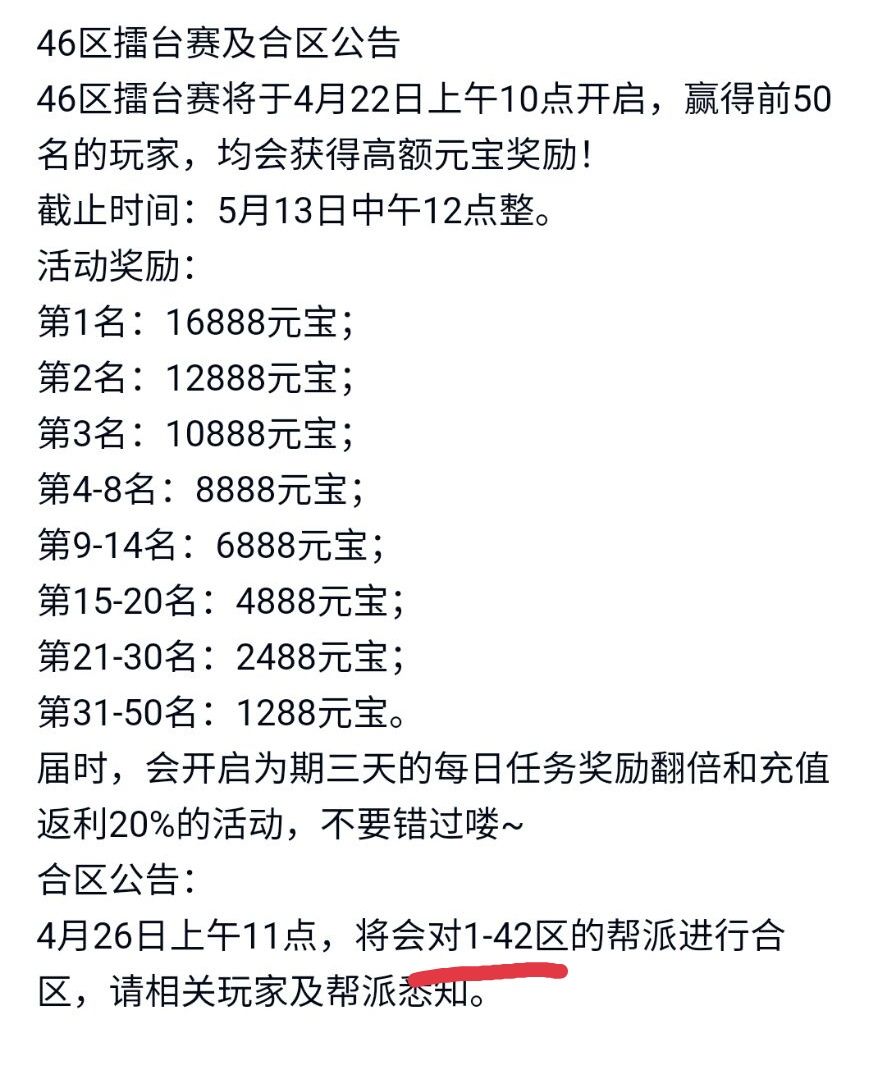 最开始合区消息是二十一还是二十二号放出来的,然后大家都在着手准备,老区的各帮主也在精心策划,可以这么说,帮主操的心比客服乃至老楚多的多。然后在这四天之内,我想肯定有很多人问过客服关于合区的事宜吧,但是隔了四天,才有客服说是弄错了,说实话,四天就改几个字这么难吗?这四天怕连几千字的文章也可以写好了吧。希望官方给个解释 不要一句道歉就揭过去了,别想以前那样三十块钱两万元宝一样,随随便便一个补偿把玩家打发了