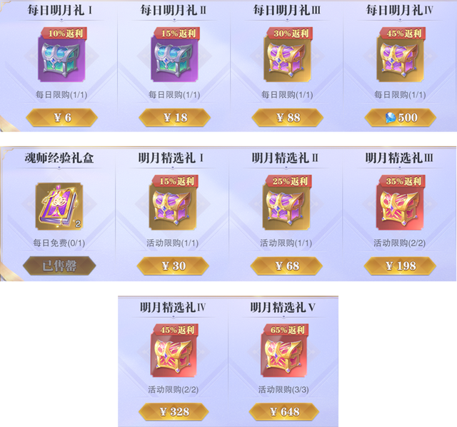 此次的月桂阁里面一共是包含了10个不同档位,不同限购方式的礼包,其中我们可以将其分为3类:每天免费的1个礼包,奖励是魂师经验礼盒×2每日限购的4个礼包,其中1个可以用500钻石购买,奖励为武魂觉醒券×2、魂师经验礼盒×18、紫金兽魂×30和累购次数×1;另外3个则使用RMB购买,档位分别为6元、18元和88元,其中也都包含累购次数×1和其余的各类资源活动限购的5个礼包,全部都是有RMB购买,其中每购买1次都可以得到累购次数×1,30元和68元是限购1次,198元和328元是限购2次,最后的648元则是限购3次