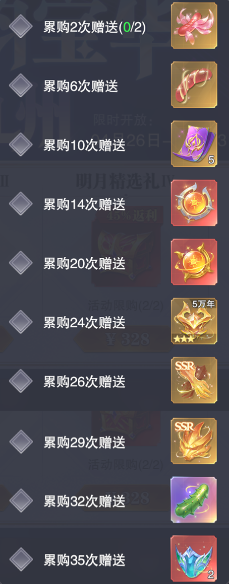 而刚刚多次提到的这个累购次数则和此次月桂阁活动的累购奖励有关,这里维一也简单给大家算一算:活动从4月26日-5月3日持续7-8天,但这里却并没有写持续到5月3日的几点,不过根据过去的惯例,这次月明华照活动应该是持续7天每天累购的最高次数为4次,如果7天你都把500钻石和3当RMB礼包购买完的话,则可以获得28次累购次数要想拿到35次森罗面骨×2奖励的玩家,则需要额外购买7次活动限购礼包,这点还请大家注意此次活动比较有价值的累购奖励无疑有24次的面部魂骨自选和35次的森罗面骨礼盒2个,不过客观说此次不管是RMB礼包,亦或是钻石礼包的性价比......都并不高,所以在5月这个即将上线疑似新魂师刺豚斗罗的风口,资源不多的朋友还是可以隐忍一下,资源足够的朋友则量力而行即可。