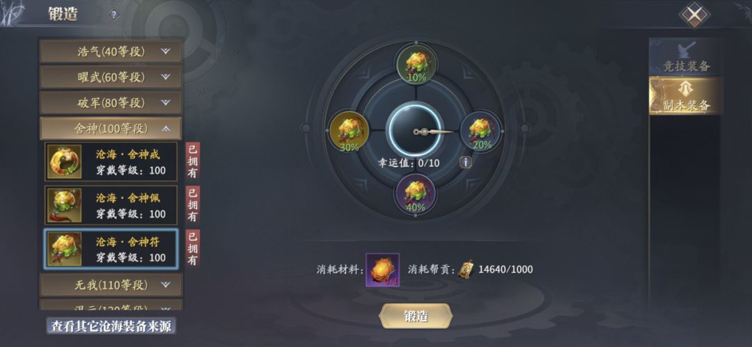 (2)副本装备锻造:帮贡还有一项很重要的作用,在每等级阶段用以锻造副本装备,如沧海戒指、佩、符,可以迅速提升角色修为。锻造所需材料,玩家可以通过生活技能自行打造,也可前往集市摆摊处购买。(装备锻造系统每次打造的装备品级均随机,但有幸运值保底必出)