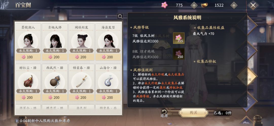 风雅点兑换建议:因获取数量有限,故而建议风雅点可暂时不消耗兑换。如需兑换请选择最最最喜欢的 > 噬元耳朵(比较百搭) > 发型类(建议选取最喜欢的1-2个即可)和饰品类(建议选取最喜欢的)> 染色剂。消耗元宝的商品可按需购买。