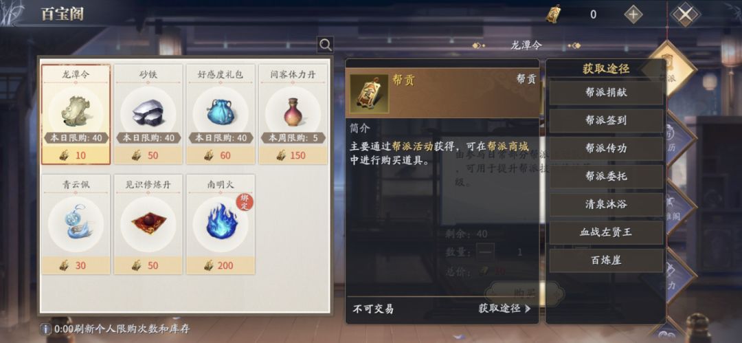 (1)百宝阁商店:分为每日限购、每周限购和不限量三类,在帮贡不足的情况下,建议优先兑换间客体力(每周限购5)> 龙潭令(每日限购40)> 砂铁(每日限购40) ;如果天脉者手中掌握了熔炼图纸,有需求的话可视情况购买南明火;其他商品可获取渠道很多,替代性很高,这里不推荐消耗帮贡来购买。