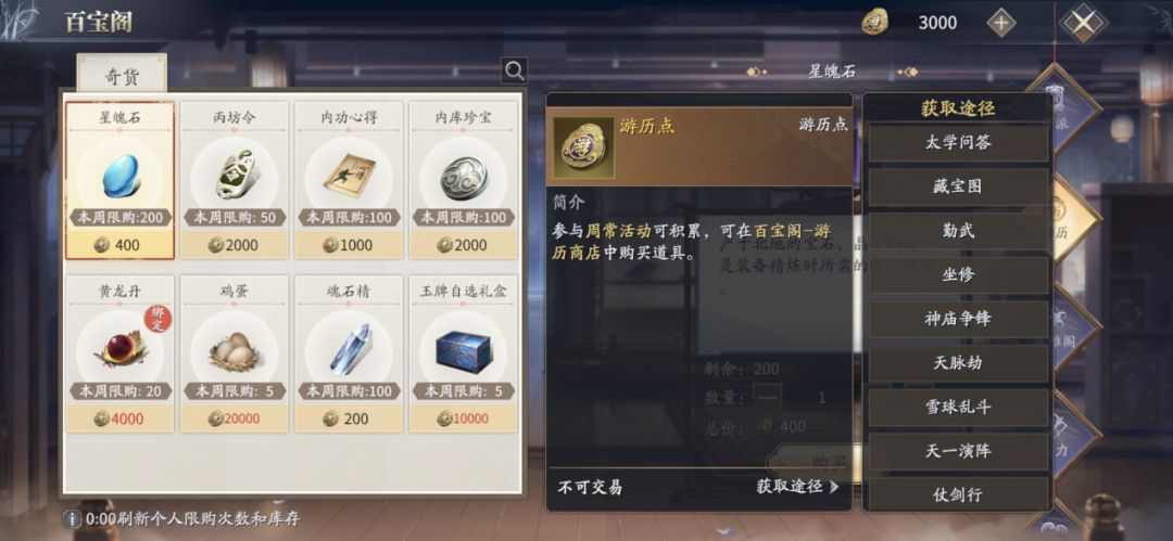 平级选择:内库珍宝(每周限购100) = 内功心得(每周限购100) = 星魄石(每周限购400)。