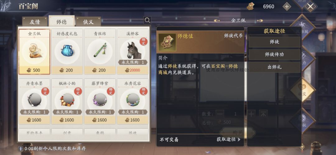 由于侠义值系统代币消耗较大,这里推荐优先购买喜欢的头像框(增加风雅值) > 坐骑乌云骓(独一无二但消耗巨大) > 青丝结(因为师徒值更容易获取)。