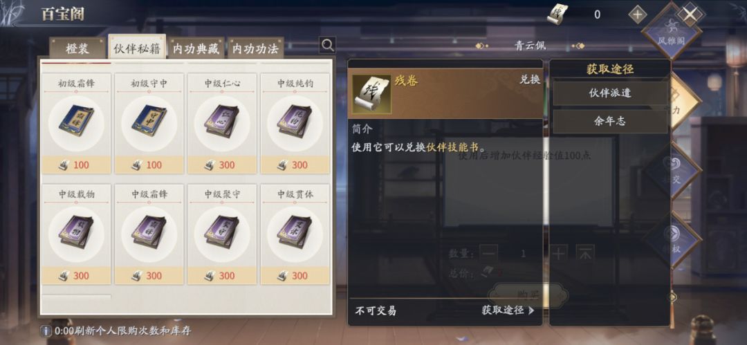 目前只推荐兑换消耗300残卷的中级伙伴秘籍。