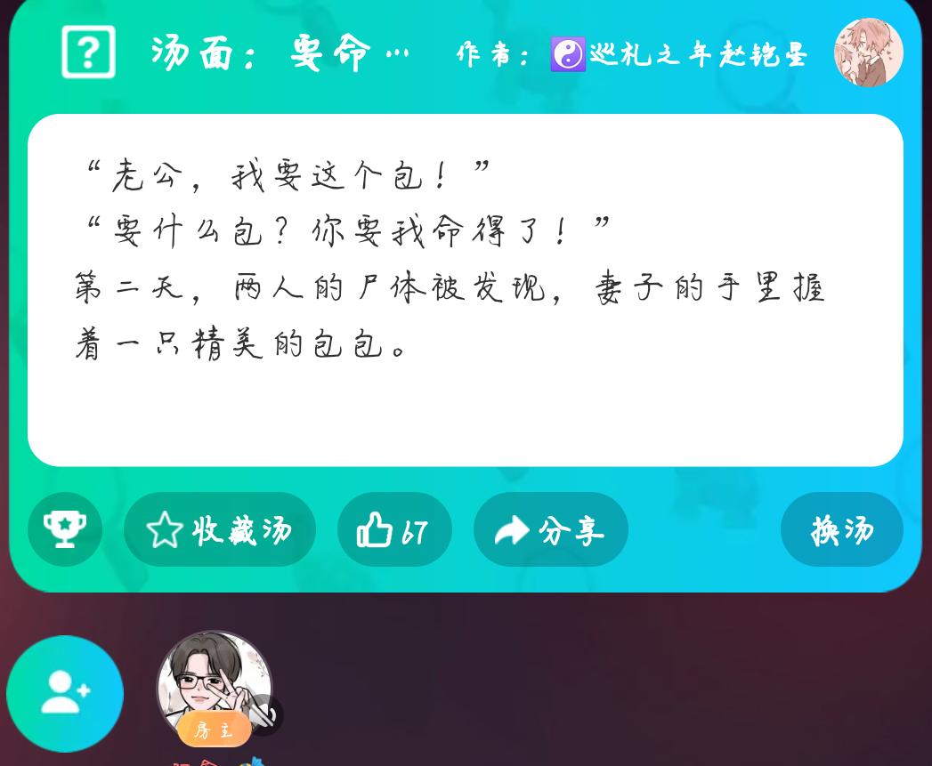 ✨现在来说一下游戏的玩法。海龟汤呢是一个情景还原类的游戏,你们可以向房主提出线索或者自己的疑问。🍀房主通过海龟汤的汤底来回答是或者不是或者不重要。就举个例子最后死人了吗,你们可以通过海龟汤的汤面来找到解答。当然还有其他隐藏的线索,你们可以用你们睿智的大脑来找到答案。🍂你们可以来下载谁是凶手,我们可以在上面一起来解谜。当然谁是凶手上还有可多好玩的小游戏。今日的每日好几汤就先,这样 明天再见👋🏻