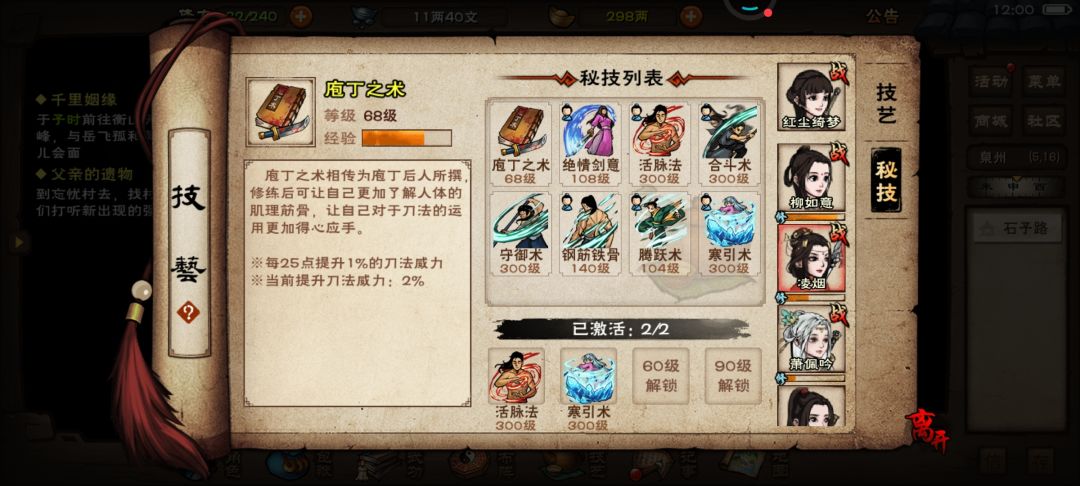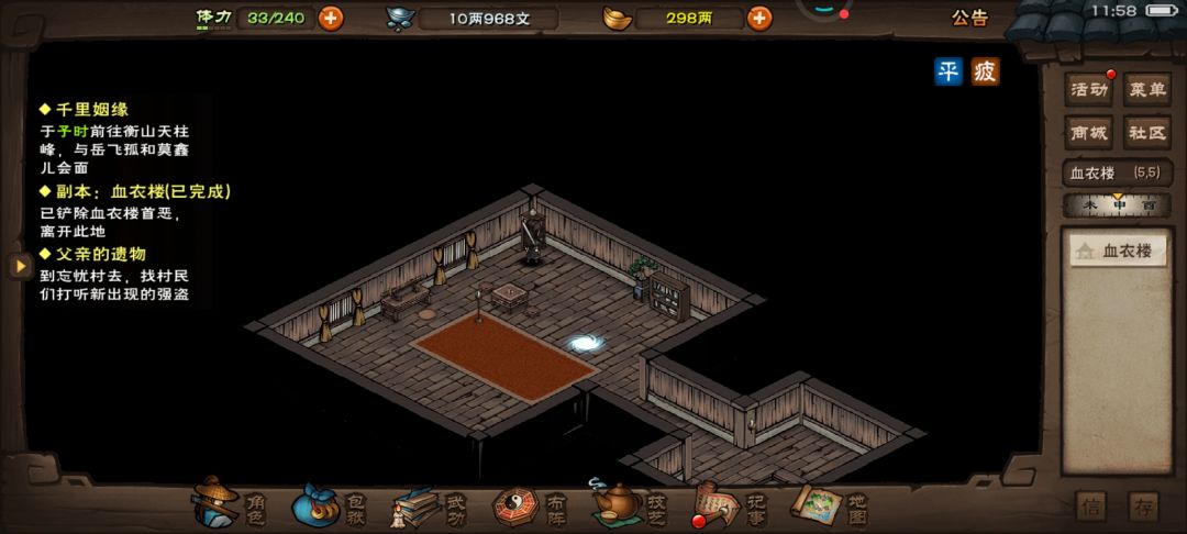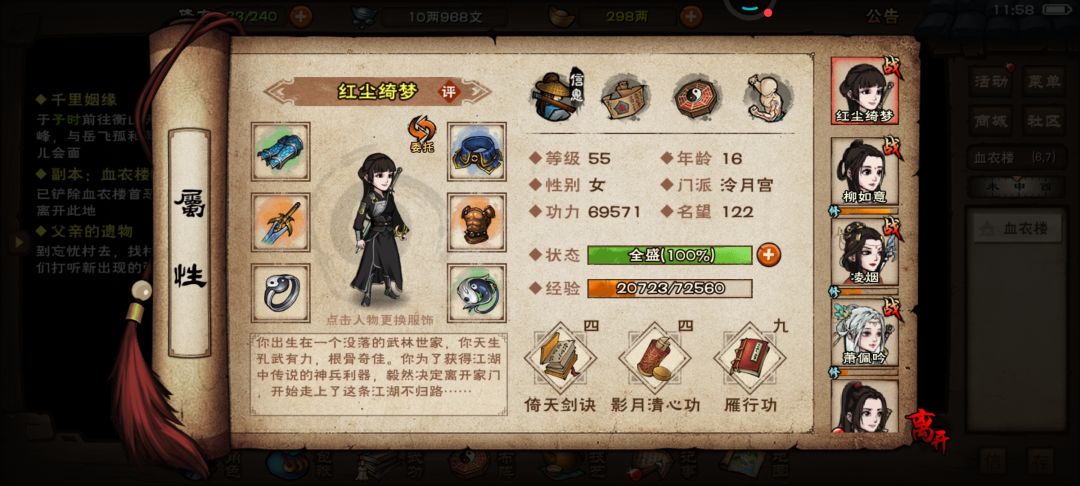 8、吐槽一下免费随从真是垃圾,老区69级天刀女主,上乘套路内功6重,带71级苏剑七星十叠浪十,71级柳拳进阶十重,70级钟棍上乘套路内功各十重,打谢阴阳被各种丝血反杀,高血压都快出来了。新区61级泠月剑上乘套路内功六重,萧剑,柳拳,凌棍,进阶全满,上个香弹个琴sl几次就过了。所以充了月卡跟基金的尽快换元宝随,早买早享受