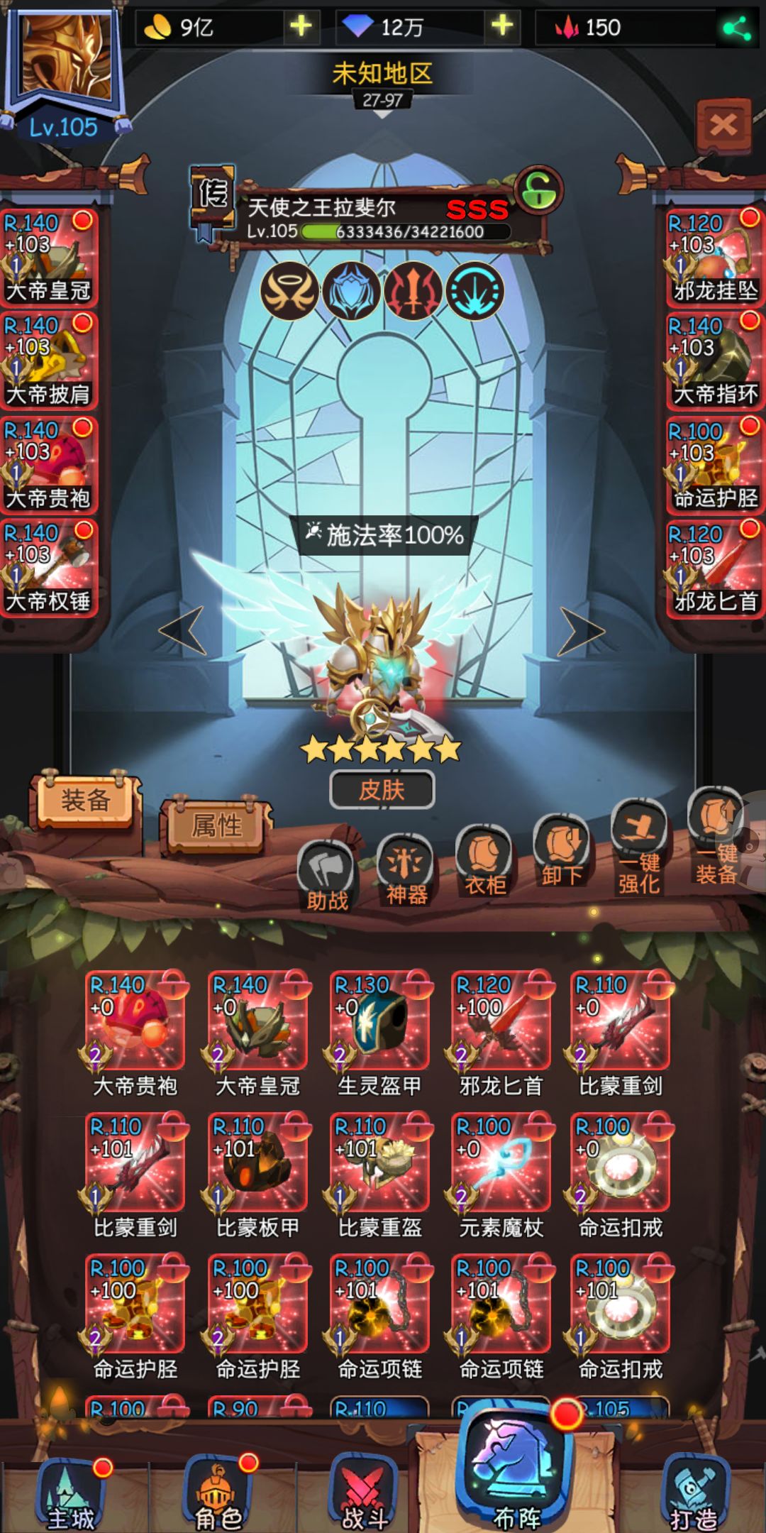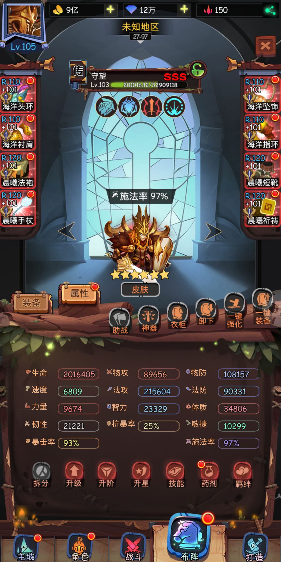 男主防御神器,寒冰被动晕,守望穿莎莎装备,天使穿攻击装,我的穿告示没有就穿正义或者狮子肉装,狮子穿的过图给的两个垃圾150光辉, 不应该升级的,要是武器可以升级,头盔升级加了8万血,感觉好亏,狮子打猪守望斩杀,男主主动被动晕冰,女皇晕后排刷脸,没有150装备的可能要睡觉。