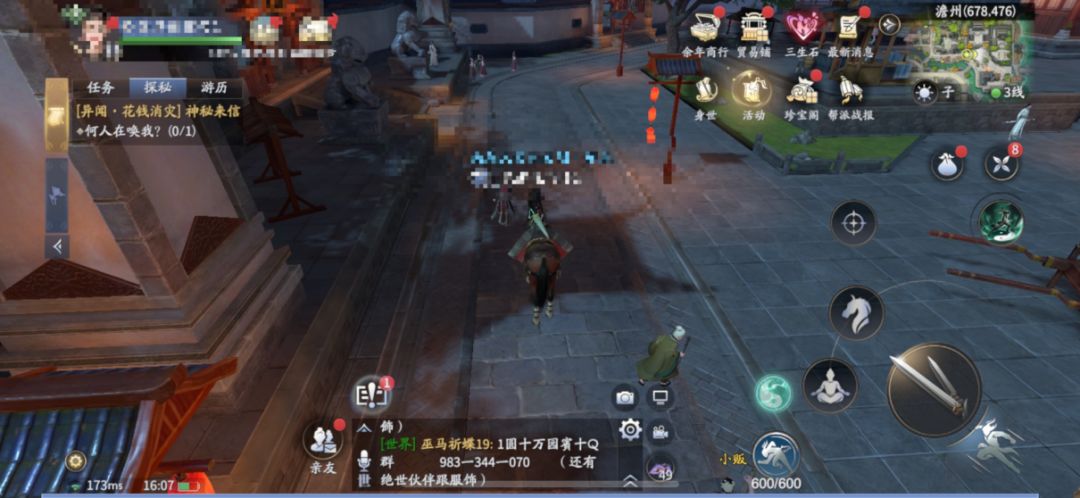 3、再闹市区的十字路口(593,497),找到路人,在她附近移动即可出发异闻。