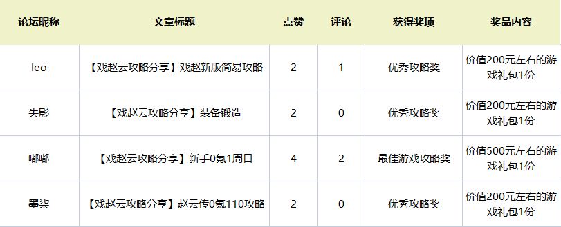 感谢大家参与本次活动,根据大家的攻略分享情况,今日公布以下玩家获得本次活动的奖品!