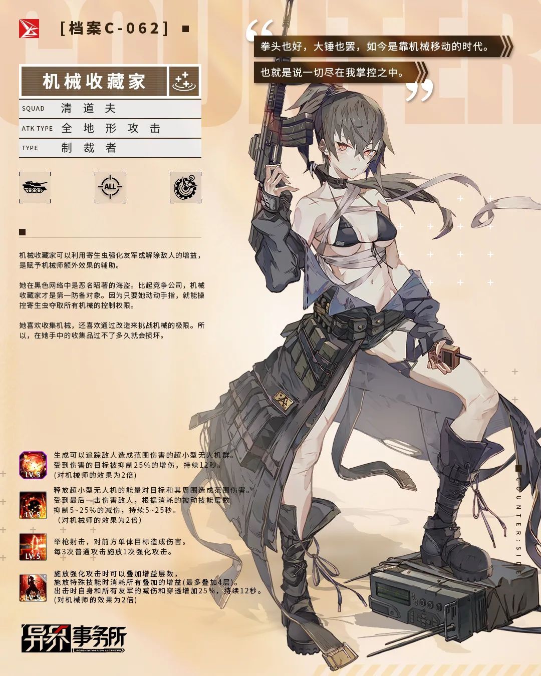 将在本周实装的新角色——觉醒机械师“进化者”,以及「清道夫」团队的“机械收藏家”、“过载者”、“隐身者”的情报已经为您获取了阅读权限。另外,今日的内容仅是一部分的更新情报,更完整的情报请老板期待明日的推送。