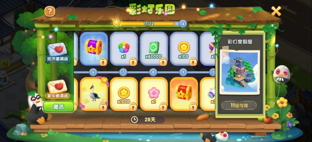 在限时邀请函-彩灯乐园,你不但可以通过免费的经济邀请函来轻松获得大量的游戏资源,激活豪华邀请函后,更可获得彩灯、彩灯时装和专属建筑皮肤,让你的小院子里面充满彩灯的元素!