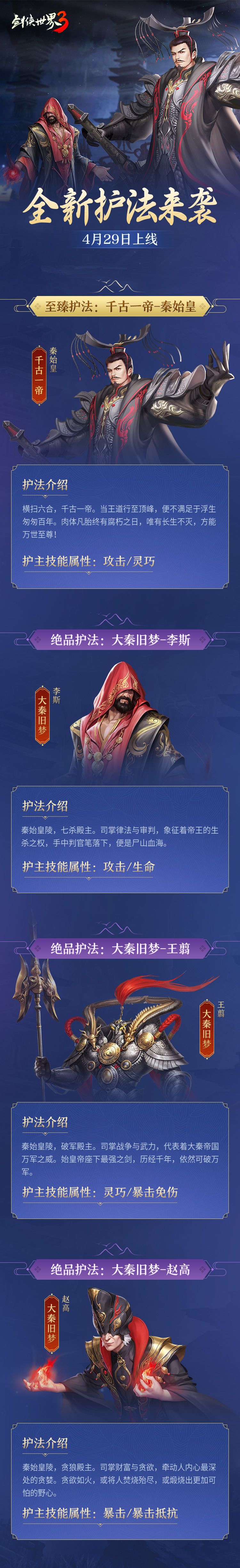 想要在江湖中有一袭之地,拥有一批强力的护法自然是不可或缺!千古一帝秦始皇、大秦名臣王翦、李斯、赵高,几位重磅护法即将现身剑侠江湖,为各位少侠再添助力!他们的背后究竟有什么样的故事?又会给少侠带来什么样的作用?戳下方长图为你揭晓答案。