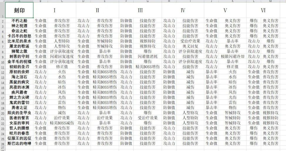 下面附上当前所有刻印的词缀总结: