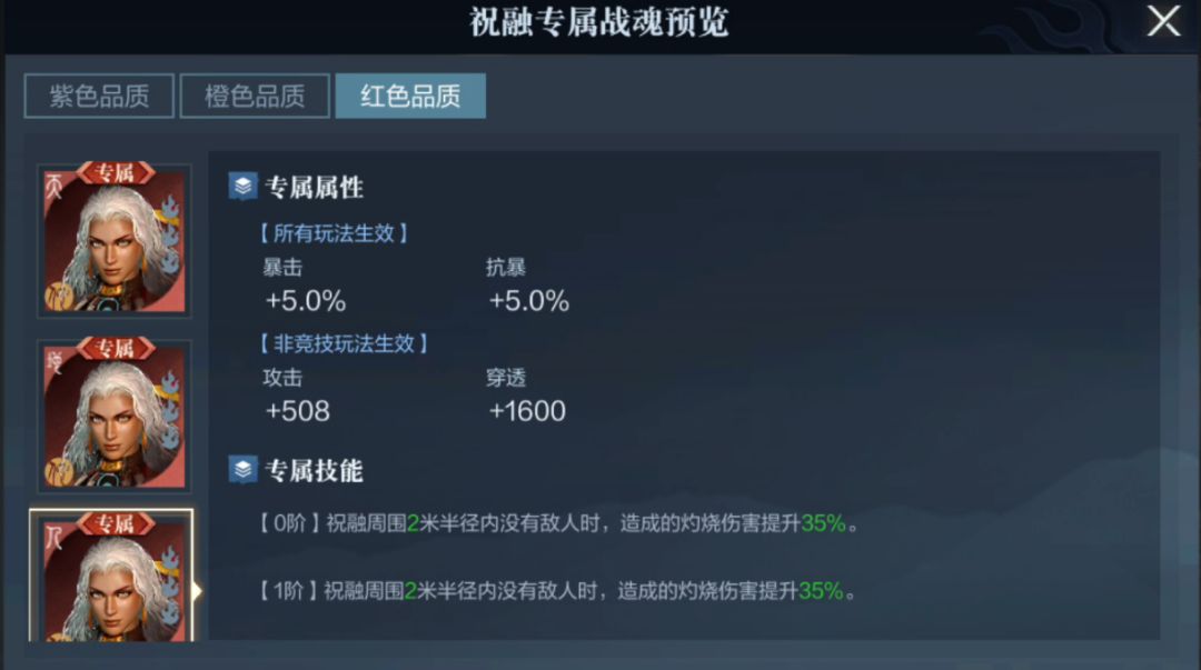 祝融周围2米半径内没有敌人时,造成的灼烧伤害提升(0阶35%;3阶46%;6阶58%;9阶70%)。